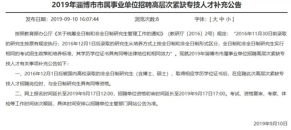這不,在2019年9月10日,山東淄博市市屬事業(yè)單位便明確指出面向社會(huì)招聘的高層次緊缺人才候選人中,非全日制研究生和全日制研究生具有同等資格,前提是2016年12月1日后被錄取的非全日制研究生。(以下圖片都可以點(diǎn)擊放大)
